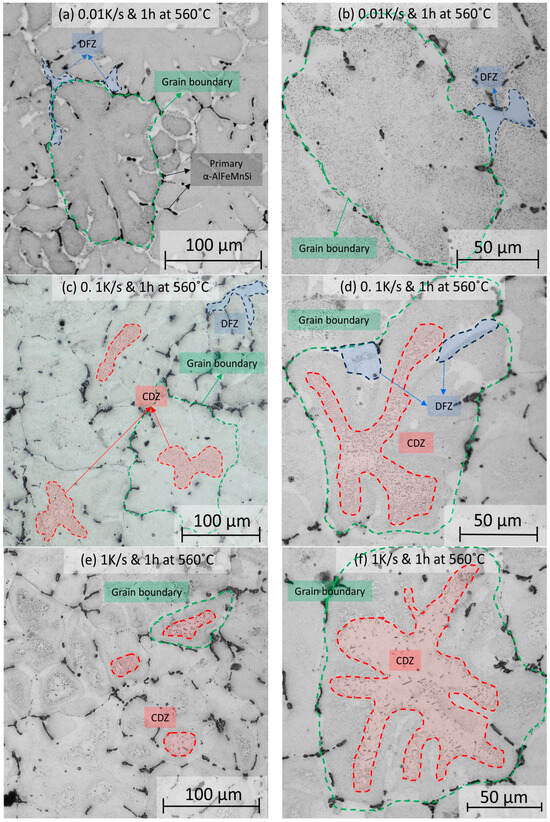 The prediction of the effect of the heating rate on dispersoid nucleation is demonstrated in Figure 6, where etched samples are shown after heating to 560 °C at four different rates (0.01, 0.1, 1, and 10 K/s) and held at 560 °C for 1 h. For the slowest heating rate, 0.01 K/s, small regions of DFZ appear near the grain boundaries, where primary phases are prominent. At the same time, α-Al15(Fe,Mn)3Si2 dispersoids distribute evenly throughout the grain, and the CDZ is absent (Figure 6a,b). On the contrary, CDZ develops at faster heating rates and becomes more prominent at higher rates. In Figure 6c,d, at a heating rate of 0.1 K/s, the heterogeneous distribution of dispersoids is seen. Marked in red, a CDZ appears in the inner section of the grains. At 1 K/s, shown in Figure 6e,f, the area of the CDZ within the grain significantly increases, where there is an even more prominent effect at the highest heating rate (10 K/s), displayed in Figure 6g,h. The optical microscopy results suggest that a larger CDZ results from faster ramps to homogenization temperatures.