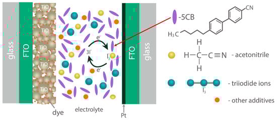 - Zhu, J.S.; Su, Y.; Liu, Y.; Niu, X.; Zhang, W.; Chen, W. Liquid crystals as electrolyte additives for improving the transmission paths of redox couples and performances of dye-sensitized solar cells. Opt. Mater. 2024, 149, 115007. [Google Scholar] [CrossRef]