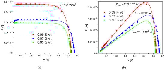 | Sample | ISC [A] | VOC [V] | P0 [W] | Pmax [W] | FF | η [%] | Iph [A] | I0 [A] | n |