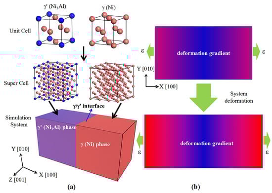 The superalloy studied in this paper is composed of γ (Ni) and γ (Ni3Al) phases, with the volume fraction of the γ phase being 13.5, 26.9, 40.3, 53.7, and 67%, respectively. The corresponding atomic percentages and weight percentages of Ni and Al atoms are listed in Table 1. The lattice constant ( a γ and a γ ) of the γ and γ phase was 0.3524 nm and 0.3573 nm, respectively. The γ / γ interfaces were oriented on the (100) plane, with orthogonal axes X, Y, Z aligned along [100], [010], and [001] directions, respectively (Figure 1a). To reduce misfit stresses from γ / γ lattice mismatch, the model’s dimensions in Y/Z directions satisfied, where ( n + 1 ) a γ n a γ (n = 72).
