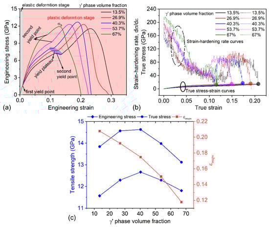 Figure 2. The stress–strain behaviors and relevant mechanical properties of the γ / γ superalloys with different γ phase volume fractions: (a) engineering stress–strain curve, (b) true stress–strain curve and strain-hardening rate–true strain curve, and the shaded circular symbol represents the intersection point of the strain-hardening rate curve and the true stress–strain curve, (c) the variation in tensile strength (true stress and engineering stress), and maximum uniform plastic strain ( ε m u p s ) with different γ phase volume fractions.