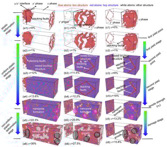 Figure 3 illustrates the γ / γ superalloys’ microstructure evolution. At an elevated temperature, the volume fraction of the γ phase significantly influenced the initial microstructure of the γ / γ superalloys before tensile deformation. Compared with Figure 3(a1,b1,c1), we observed that the stacking faults, which resulted from the lattice mismatch of two phases (the γ and γ phase), predominantly formed in the γ phase, when the γ / γ superalloys displayed a lower V γ (13.5%). Conversely, for higher V γ (from 40.3 to 67%), we observed the stacking faults in the γ phase. During tension, the deformation process consisted of three main stages: elastic deformation, uniform plastic deformation, and non-uniform plastic deformation. When the engineering strain ( ε ) was less than 1%, only elastic deformation occurred in these systems. This resulted in a slight increase in the equilibrium distance between atoms without altering the system’s microstructure. When the engineering strain exceeded 1%, the system transitioned into the uniform plastic deformation stage, characterized primarily by the stacking faults evolution and the phase transformation of local atoms from a Face-Centered Cubic (FCC) structure to the Body-Centered Cubic (BCC) and the Hexagonal Close-Packed (HCP) structures. The deformation behaviors of the γ / γ superalloys were associated with the volume fraction of the γ phase. Once the engineering tensile stress reached its tensile strength ( σ b ), the deformation system entered the non-uniform plastic deformation stage.