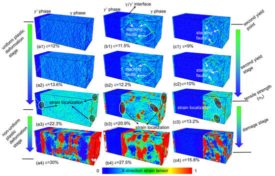 Figure 4 shows the atomic strain distributions of the γ / γ superalloys with different V γ . During the uniform plastic deformation stage, for the γ / γ superalloy with a low V γ (Figure 4(a1–a4)), the atomic strain was almost uniformly distributed within the γ phase. In contrast, for the γ / γ superalloy with a high V γ (Figure 4(b1–b4,c1–c4)), the atomic strain was localized at the intersecting region between the stacking faults and phase transformation of the local atoms. Once the engineering tensile stress moved up to the tensile strength, the atomic strain was considerably localized at the local region of the γ phase (the white oval-shaded area in Figure 4(a3,b3,c3)).