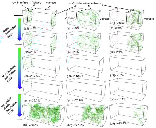 Figure 5 shows the evolution of dislocation configuration of the γ / γ superalloy with varying V γ during deformation. Before deformation, the misfit dislocation networks were formed in the γ phase (for γ / γ superalloy with V γ = 13.5%) and the γ phase (for γ / γ superalloy with V γ > 13.5%) in the NPT relaxation process. The morphology of misfit dislocation networks remained virtually unchanged during the elastic deformation stage. Subsequently, as a result of local atoms from the FCC → BCC structural phase transformation at the uniform plastic deformation stage, the misfit dislocation networks gradually dissipated within the system. Once the system entered the non-uniform plastic deformation (damage) stage, we observed a notable dislocation proliferation behavior because of the formation and growth of nanopores emitting numerous dislocations.