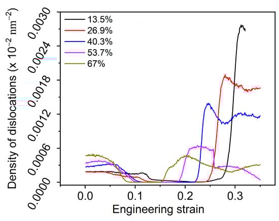 Figure 6 depicts variations in dislocation density of the γ / γ superalloys with different V γ . With V γ increasing, the initial dislocation density of the tensile system gradually increased. Throughout the deformation process, the dislocation density first decreased gradually to 0 nm−2 and then remained constant until the completion of the uniform plastic deformation stage of the tensile system. When nanopores emerged in the system, there was a rapid increase in dislocation density. For systems with various V γ , the rates of dislocation annihilation and proliferation during deformation varied accordingly. Specifically, a higher V γ was associated with an accelerated rate of dislocation annihilation and a decelerated rate of proliferation.