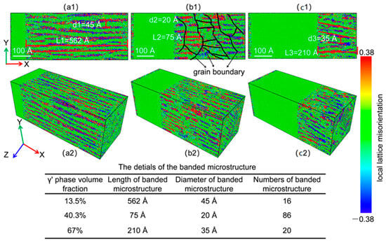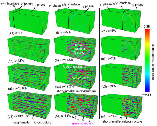 Figure 7 illustrates the evolution of local crystal orientations of the γ / γ superalloys with varying V γ during deformation. The local crystal orientations refer to the spatial arrangement of atoms in specific microregions of a crystalline material, relative to a reference coordinate system [33,34]. These orientations describe how the lattice structure is oriented at the subgrain or nanoscale, influencing the material deformation behavior. A local crystallographic orientation analysis of the superalloy revealed that the homogeneous single γ phase transformed into lamellar structures with different local crystallographic orientations (Figure 7(a3,b3,c3)). When the V γ were 13.6 and 67%, the tensile system acquired long- and short-lamellar structures, respectively (Figure 7(a4,c4)). When the V γ = 40.3%, because of the interaction between the stacking faults and the mixed BCC/HCP structure (which resulted from the phase transformation), the fault phenomenon occurred in the lamellar microstructure of the γ phase, which resulted in the formation of the fault structure. Then the fault structure gradually evolved into grain boundaries (the magenta solid line in Figure 7(b4)), which caused a tear in the long-lamellar microstructure and thus created the short-lamellar microstructure (Figure 7(b4)).