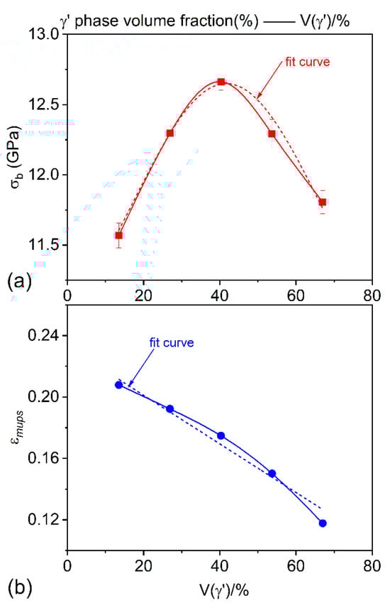 Figure 8 shows the mechanical properties of the tensile systems with various γ phase volume fractions. As the V γ increased, the tensile strength ( σ b ) of the deformation system first increased to a maximum value ( V γ = 40.3 % , σ b = 12.66   G P a ) and then decreased. The σ b V γ curve formed a parabolic shape. Using nonlinear fitting method, the functional relationship between the V γ and its tensile strength ( σ b ) in the γ / γ superalloy was obtained, as shown in Formula (2):