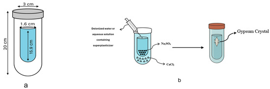 (a) Schematic representation of the coaxial test tube setup used for gypsum crystallization, showing the inner and outer tubes with respective dimensions. (b) Illustration of the initial steps of gypsum crystal formation through the reaction of Na2SO4 and CaCl2 in either deionized water or a superplasticizer-containing solution.