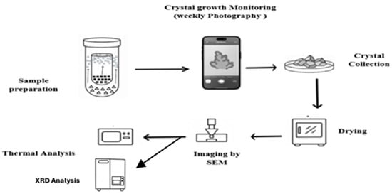 General schematic representation of the experimental workflow, including sample preparation, photographic monitoring of crystal growth, crystal collection and drying, SEM imaging, XRD analysis and thermal analysis.