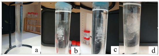 At the fourth week of gypsum (CaSO4·2H2O) crystallization in the presence of different concentrations of the superplasticizer Sika® ViscoCrete® 120P, a clear concentration-dependent effect on the nucleation and early crystal growth process was observed. At 0.5%, small and relatively distinct crystal clusters appeared on the inner wall of the tube, indicating the onset of nucleation under conditions with relatively low diffusion limitation. At 1%, the crystals were fewer, smaller, and more widely dispersed, suggesting the beginning of the inhibitory effect of the superplasticizer on crystal development. At 1.5%, only one or two tiny crystals were visible, reflecting a significant reduction in nucleation rate and a more pronounced restriction of ion mobility in the solution. Finally, at 2%, no visible crystals were observed and the solution remained clear, indicating that nucleation was completely suppressed at this high concentration of Sika® ViscoCrete® 120P. These results demonstrate that increasing concentrations of this superplasticizer effectively control gypsum crystallization by limiting mass transfer and diffusion in the system cf. Figure 8.