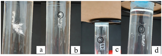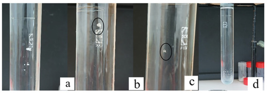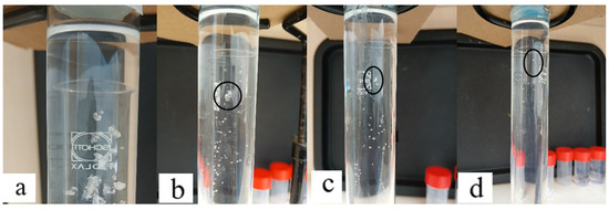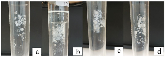 Effect of Sika® ViscoCrete® 430P concentration on gypsum (CaSO4·2H2O) crystal growth and morphology after 12 weeks: (a) 0.5%—large, transparent, well-formed crystals; (b) 1%—dense aggregates adhering to the tube wall; (c) 1.5%—smaller, rounded, sparsely distributed crystals; (d) 2%—fine, irregular, and highly clustered crystals. Higher concentrations increasingly inhibit both nucleation and growth through diffusion and surface interaction mechanisms.