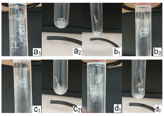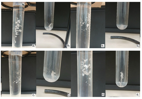 Effect of Sika® ViscoCrete® 120P concentration on gypsum (CaSO4·2H2O) crystallization after 12 weeks: (a1,a2) 0.5%—large, branched crystals with partial settling; (b1,b2) 1%—fewer, dispersed crystals showing moderate inhibition; (c1,c2) 1.5%—fine, irregular particles indicating strong suppression; (d1,d2) 2%—localized growth with wall-adhered and upward-growing crystals. Crystal size and order decrease with increasing SP-120 concentration.