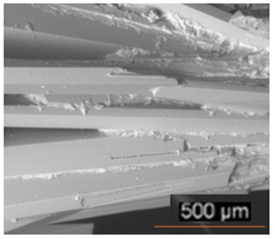 The gypsum crystals synthesized via diffusion in the absence of any superplasticizer, after 12 weeks, exhibit a distinct acicular (needle-like) morphology cf. Figure 11. These elongated, narrow, and sharp structures are characteristic of natural crystal growth in a saturated environment and are primarily attributed to rapid nucleation and random crystal development. The crystals appear densely packed with minimal spacing between them, often showing overlapping and interlocking arrangements, indicative of uncontrolled growth and a high nucleation rate. Their growth direction is random and lacks any specific alignment, suggesting that crystallization occurred freely without any physical or chemical constraints. Moreover, the crystal boundaries are generally indistinct or merged, which can be explained by the high density and simultaneous growth within localized regions. The overall structure is highly compact, leaving virtually no voids between particles. Such microstructural compactness may lead to reduced permeability and increased brittleness in the final gypsum-based material.