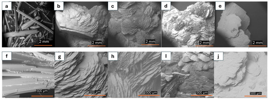 Combined SEM images of gypsum crystals formed in the presence of Sika® ViscoCrete® 120P at different dosages: (a–e) low-magnification views illustrating the morphological evolution from acicular crystals (reference) to smooth, aligned platy sheets (0.5%), thicker plates with slight misalignment (1.0%), fan-like irregular forms (1.5%), and bulky, merged aggregates (2.0%); (f–j) corresponding high-magnification views confirming microstructural details, progressive loss of alignment, increased disorder, and aggregation as the dosage increases. Scale bars: 2 mm for (a–e), 500 µm for (f–j).