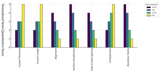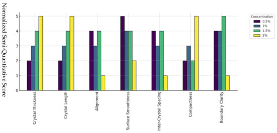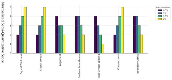 Quantitative comparison of gypsum crystal properties at different concentrations of Sika® ViscoCrete® 430P. The vertical axis (1–5) represents a normalized scale based on semi-quantitative scoring from image analysis. With increasing concentration from 0.5% to 2%, crystal thickness and length increase, while alignment, surface smoothness, inter-crystal spacing, and boundary clarity progressively decrease. The 2% sample shows the highest compactness and lowest structural order, indicating dense but disordered crystal growth. These trends confirm the morphological transition observed in SEM images, highlighting the concentration-dependent impact of the superplasticizer on crystal formation.
