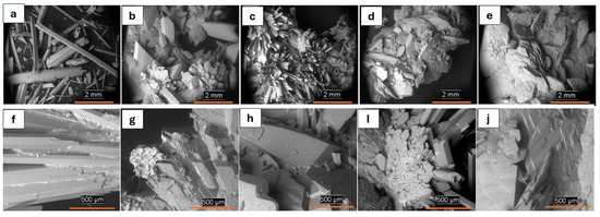 Combined SEM images of gypsum crystals formed in the presence of Sika® ViscoCrete® 111P at different dosages: (a–e) low-magnification views showing the evolution from prismatic crystals with rosette-like formations (reference) to smoother, elongated and aligned prismatic crystals (0.5–1.0%), partially aggregated crystals with reduced boundary clarity (1.5%), and compact, indistinct aggregates (2.0%); (f–j) corresponding high-magnification views highlighting microstructural changes, including surface roughness, aggregation, and morphological irregularities with increasing dosage. Scale bars: 2 mm for (a–e), 500 µm for (f–j).