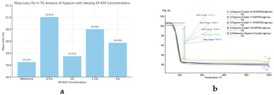 The thermogravimetric (TG) analysis of gypsum crystals synthesized with different concentrations of the superplasticizer Sika® ViscoCrete® 430P reveals a clear concentration-dependent effect on water content and crystal structure illustrated in Figure 19a,b. The highest mass loss was observed in the sample containing 0.5% SP-430 (21.01%), suggesting enhanced incorporation of structural water or a more open crystalline network that facilitates thermal release. In contrast, the reference sample (no additive) showed the lowest mass loss (19.12%), indicating a denser, more stable crystalline framework with lower water retention. Samples with 1.5% and 2% SP-430 exhibited intermediate mass losses of 20.50% and 19.93%, respectively, while the 1% sample showed 19.37%, slightly higher than the reference. These results demonstrate that low concentrations of SP-430 promote water integration and potentially more porous crystal formation, whereas higher concentrations reduce crystallinity or restrict water incorporation, leading to more compact and thermally stable structures.