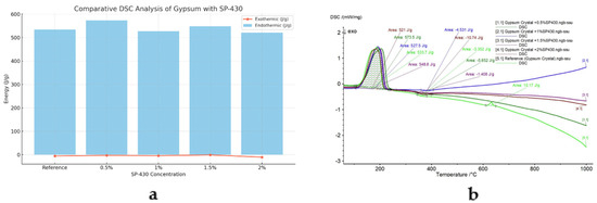 (a) Comparison of endothermic and exothermic energies in gypsum crystals with different SP-430 superplasticizer concentrations based on DSC analysis. (b) Differential scanning calorimetry (DSC) curves of gypsum crystals synthesized with various concentrations of Sika® ViscoCrete® 430P (0.5%, 1%, 1.5%, and 2%) compared to the reference sample without superplasticizer. The curves correspond to reference (light green), 0.5% (black), 1% (blue), 1.5% (purple), and 2% (red).