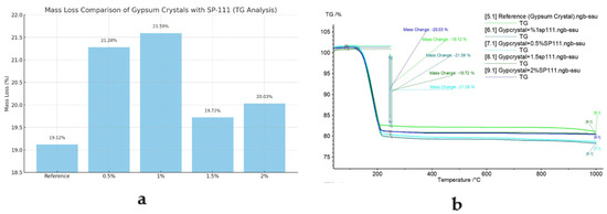 The second investigated superplasticizer revealed notable variations in mass loss within the temperature range of approximately 100–200 °C, corresponding to the dehydration of crystalline water (CaSO4·2H2O → CaSO4·½H2O + H2O). The highest mass loss was observed in the 1% SP-111 sample (21.59%), indicating either a higher water content in the crystal lattice or enhanced release capability due to structural modification. This was followed by the 0.5% (21.28%) and 2% (20.03%) samples, all of which showed greater water loss than the reference gypsum crystal (19.12%), implying that SP-111 promotes higher water retention or looser crystal formation as shown in Figure 21a,b. Interestingly, the 1.5% sample demonstrated a relatively lower mass loss (19.72%), which may be attributed to a denser crystalline network or restricted water release. These findings highlight the concentration-dependent dual effect of SP-111 on gypsum crystallization and thermal behavior, with 1% concentration showing the most significant enhancement in structural water release see in Figure 21a,b.
