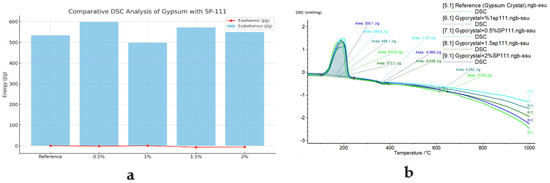 The DSC (Differential Scanning Calorimetry) analysis of gypsum crystals synthesized with varying concentrations of SP-111 superplasticizer reveals notable differences in thermal behavior as illustrated in Figure 22a,b. The highest endothermic energy absorption was recorded in the 0.5% SP-111 sample (598.8 J/g), indicating a more ordered crystalline structure and higher structural water content. This was followed by the 1.5% and 2% samples, which exhibited enthalpy values of 572.2 J/g and 550.1 J/g, respectively. The reference sample without any additive showed a moderate value of 533.8 J/g. In contrast, the 1% SP-111 sample displayed the lowest endothermic peak area at 498.1 J/g, suggesting that this specific concentration may disrupt crystallization and reduce the energy required for dehydration. This non-monotonic trend in crystal stability may arise from competing effects of polymer adsorption and surface coverage at different concentrations. At intermediate concentrations (1 wt %), polymer coverage likely interferes most strongly with the lattice ordering, resulting in the lowest dehydration enthalpy, while at higher concentrations (1.5 wt %), more uniform surface saturation may allow for a slightly more ordered growth. These trends confirm that SP-111 influences gypsum’s crystallization and thermal behavior in a concentration-dependent manner—lower concentrations (especially 0.5%) enhance crystallinity and thermal stability, whereas higher concentrations tend to weaken this effect. In the exothermic region of the DSC curve, occurring roughly between 600 °C and 700 °C, exothermic peaks were only observed in the samples containing 0.5%, 1.5%, and 2% SP-111. The corresponding released energies were −1.87 J/g, −6.838 J/g, and −5.969 J/g, respectively. These exothermic responses are likely associated with structural rearrangements or recrystallization events triggered by elevated temperatures. In addition, partial thermal degradation of residual organic superplasticizer components adsorbed on the crystal surfaces may also contribute to the observed exothermic peaks. The most intense exothermic effect was observed in the 1.5% sample, possibly due to the presence of a less stable crystal network prone to thermal decomposition. The absence of exothermic activity in the reference and 1% SP-111 samples suggests that SP-111 at certain concentrations alters the crystal structure in a way that enhances reactivity at high temperatures. Overall, the DSC results indicate that SP-111 not only affects dehydration processes but also modulates the thermal stability and transformation pathways of gypsum under high-temperature conditions.