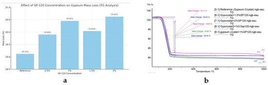 The thermogravimetric (TG) analysis of gypsum crystals synthesized with varying concentrations of SP-120 superplasticizer demonstrates a clear concentration-dependent effect on thermal dehydration behavior as illustrated in Figure 23a,b. The reference sample (without additive) showed the lowest mass loss at 19.12%, suggesting a denser, more thermally stable crystalline structure. With the addition of 0.5% SP-120, mass loss increased slightly to 19.90%, indicating marginal enhancement in water content or release. A more notable increase was observed at 1% and 1.5% SP-120, with mass losses of 20.45% and 20.04%, respectively, reflecting both improved water incorporation and structural modifications facilitating dehydration. The maximum mass loss occurred in the 2% SP-120 sample (20.62%), pointing to a more open or disrupted crystal network capable of holding and releasing greater amounts of structural water. Overall, these findings suggest that SP-120 influences the hydration–dehydration characteristics of gypsum, with higher concentrations enhancing thermal water release, likely due to changes in crystal morphology and porosity.