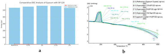 The DSC (Differential Scanning Calorimetry) analysis of gypsum crystals synthesized with varying concentrations of SP-120 superplasticizer reveals significant differences in thermal behavior as illustrated in Figure 24a,b. In the endothermic region, occurring between approximately 100 °C and 200 °C, the highest energy absorption was recorded in the sample containing 1% SP-120 (562 J/g), indicating a more ordered crystalline structure and higher structural water content. The 1.5% and 2% SP-120 samples followed closely with values of 558 J/g and 557.4 J/g, respectively, reflecting consistent thermal performance and structural stability. The 0.5% SP-120 sample also demonstrated a high enthalpy value of 550.7 J/g. In contrast, the reference sample without any additive exhibited the lowest energy uptake (533.7 J/g), suggesting a denser structure with lower thermal responsiveness. These findings indicate that SP-120 enhances the thermal dehydration behavior of gypsum, particularly at the 1% concentration, likely due to improved crystallinity. In the exothermic region, observed between approximately 300 °C and 400 °C, exothermic peaks were detected only in the reference sample (3.352 J/g), the 0.5% SP-120 sample (2.122 J/g), and the 1.5% SP-120 sample (5.19 J/g). These peaks are associated with structural rearrangements or recrystallization processes initiated at elevated temperatures. In addition, partial thermal degradation of residual organic superplasticizer components adsorbed on the crystal surfaces may also contribute to the observed exothermic heat release. The most pronounced exothermic response was seen in the 1.5% SP-120 sample, possibly indicating a less stable and more reactive crystalline lattice. The absence of exothermic activity in the 1% and 2% SP-120 samples suggests greater structural stability or reduced energy release potential. Overall, these results demonstrate that SP-120 not only influences the dehydration process of gypsum but also alters its thermal stability and high-temperature transformation pathways in a concentration-dependent manner.