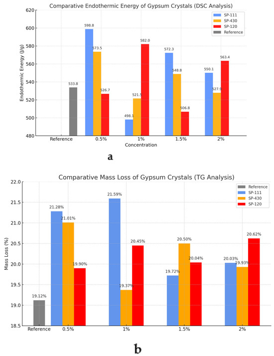 (a) Comparison of endothermic enthalpy values (J/g) of gypsum crystals synthesized with different concentrations of three superplasticizers (SP-111, SP-120, and SP-430), as measured by DSC. (b) Comparative mass loss analysis of gypsum crystals containing various concentrations of SP-111, SP-430, and SP-120 superplasticizers based on TG measurements.