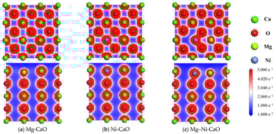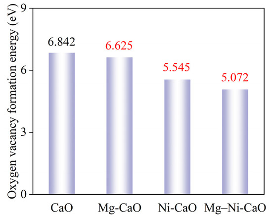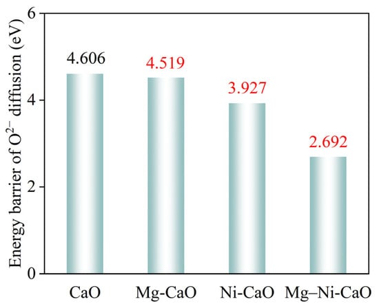 - Both single doping and co-doping of Mg and Ni can significantly regulate the energy state of the CaO system. The oxygen vacancy formation energy for pure CaO is 6.842 eV, while for Mg-CaO, Ni-CaO, and Mg–Ni-CaO, it drops to 6.625 eV, 5.545 eV, and 5.072 eV, respectively. Mg–Ni co-doping exhibits stronger synergistic effects, further reducing the formation energy of oxygen vacancies and making them easier to form. During O2− diffusion, the energy barrier on a pure CaO surface is 4.606 eV. On the surfaces of the Mg-CaO, Ni-CaO, and Mg–Ni-CaO doped systems, the O2− diffusion energy barriers show significant differences, with values of 4.519, 3.927, and 2.692 eV, respectively. The synergistic doping of Mg and Ni can significantly reduce the energy threshold for ion migration, significantly enhancing O2− diffusion efficiency and providing a more favorable ion transport pathway for CO2 adsorption.