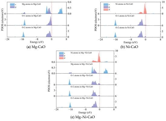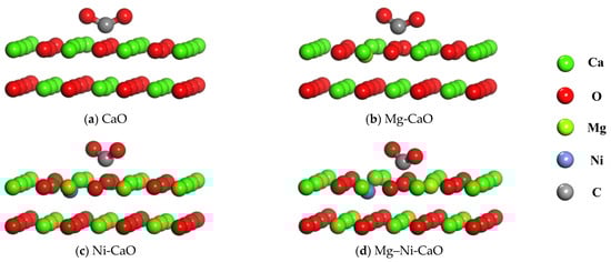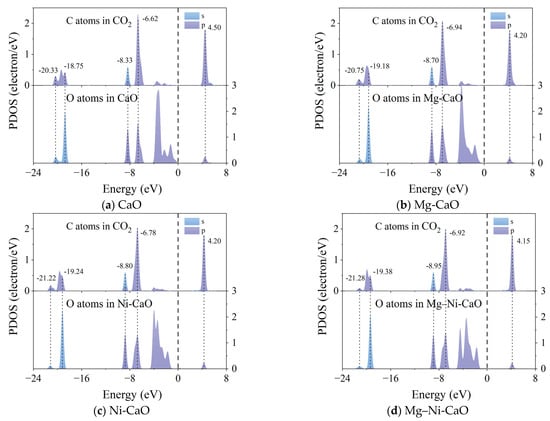 - Doping with Mg and Ni improved the adsorption capacity of CaO for CO2. On the surfaces of CaO, Mg-CaO, Ni-CaO, and Mg–Ni-CaO, CO2 forms stable CO32− structures with surface O atoms, with adsorption energies of −1.484 eV, −1.522 eV, −1.627 eV, and −1.703 eV, respectively. Mg–Ni-CaO exhibits the highest CO2 adsorption energy, indicating that it has the strongest adsorption capacity for CO2. The PDOS analysis further revealed the microscopic mechanism of Mg and Ni doping enhancing CO2 adsorption capacity. Namely, Mg and Ni doping shifted the energy of the resonance peak downward, and the energy shift was more obvious with co-doping, significantly enhancing the interaction between C and O atoms.
