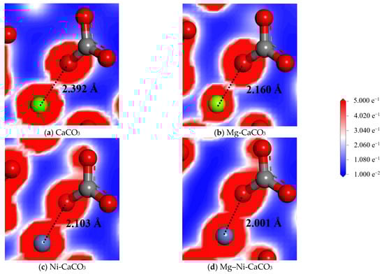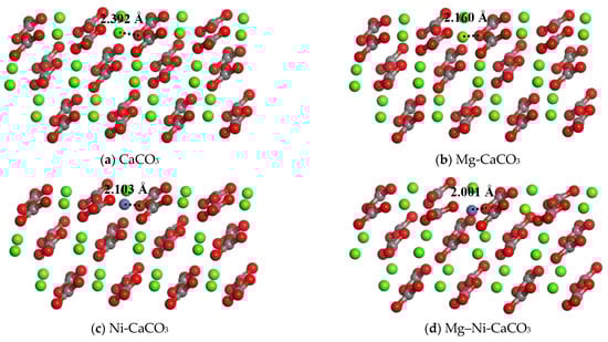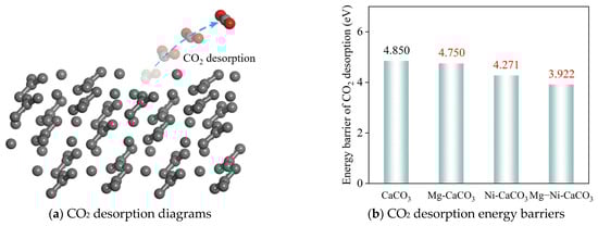 - The doping of Mg and Ni promotes the desorption process of CO2. On the surfaces of CaCO3, Mg-CaCO3, Ni-CaCO3, and Mg–Ni-CaCO3, the energy barriers for CO2 desorption are 4.850 eV, 4.750 eV, 4.271 eV, and 3.922 eV, respectively. The doping of Mg and Ni and their synergistic effect significantly reduced the CO2 desorption energy barrier, greatly promoting the CO2 desorption process.