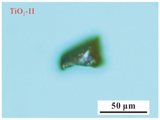 The synthesis experiment for TiO2-II utilized a symmetric-type diamond anvil cell (DAC) equipped with a pair of type Ia diamond anvils (culet diameter: ~0.3 mm). A rhenium gasket was pre-indented to a thickness of ~60 μm, and a sample chamber ~0.15 mm in diameter was drilled. Due to the limitations of the sample chamber dimensions, the grains of rutile were crushed into fragments (ranging from 30 to 60 μm in size). For each pressure-induced phase transition experiment, a fragment was loaded into the sample chamber with ruby spheres, and the chamber was backfilled with neon as the pressure-transmitting medium. Based on pressure calibration via the shift of the ruby R1 luminescent line [21], the rutile fragment was first compressed to 18–19 GPa and then gradually decompressed to ambient pressure. During decompression to ambient pressure, the rutile fragment transformed into TiO2-II. To obtain a sufficient quantity of TiO2-II samples (as well as backup samples), this experiment was repeated multiple times. The recovered TiO2-II samples (Figure 2) were subsequently used for further experiments in this study. The infrared spectrum (acquired using the same method as for the rutile sample) of the TiO2-II sample exhibited strong absorption peaks in the 2800–3600 cm−1 region (Figure 3), indicating that water in rutile can be retained in a TiO2-II sample after undergoing a pressure-induced phase transition to TiO2-II.
