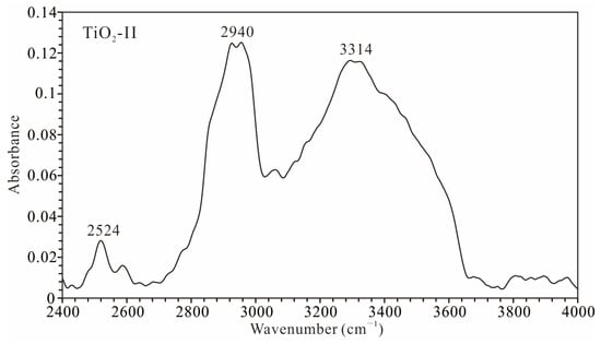 The infrared spectral characteristics of the TiO2-II sample in this study (Figure 3) differ from those reported in previous studies for Al-bearing TiO2-II samples [16]. Although the hydroxyl vibration peak at approximately 2940 cm−1, documented in prior research [16], was also observed in the infrared spectrum of the TiO2-II sample in this study (Figure 3), the spectrum of our sample additionally exhibited a series of broad and strong absorption peaks within the 3000–3600 cm−1 region (Figure 3). In mineral crystal structures, O-H stretching frequencies are governed by O-H···O hydrogen bond lengths. Higher wavenumbers of O-H bands typically correspond to weaker hydrogen bonding, while lower wavenumbers indicate stronger hydrogen bonding [25]. During the synthesis of TiO2-II in this study, the original tetragonal rutile sample undergoes multiple phase transitions under pressure cycling (compression and decompression) to ultimately form the lower-symmetry orthorhombic TiO2-II phase [15]. This process involves the breaking and reconstruction of primary chemical bonds and the rearrangement of hydrogen atoms. Consequently, compared with the hydrogen-bonding configurations within the original rutile, those in the resultant TiO2-II phase are likely more complex. Therefore, the presence of the peak at 2940 cm−1 alongside broad absorptions across 3000–3600 cm−1 suggests that hydroxyl groups occupy multiple nonequivalent sites with distinct hydrogen-bonding environments in the crystal structure.