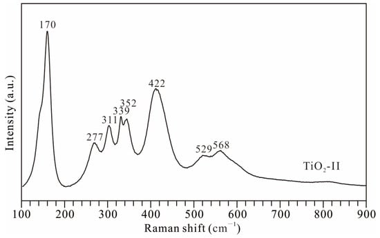 The Raman spectrum of the sample obtained from the pressure-induced phase transition experiment under ambient conditions exhibited scattering peaks at 170, 277, 311, 339, 352, 422, 529, and 568 cm−1 (Figure 4). These spectral features match those reported in previous studies for TiO2-II samples synthesized via compression experiments [15], confirming the successful transformation of natural rutile into TiO2-II.