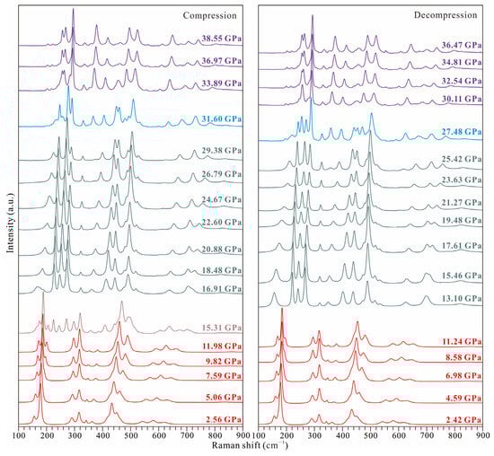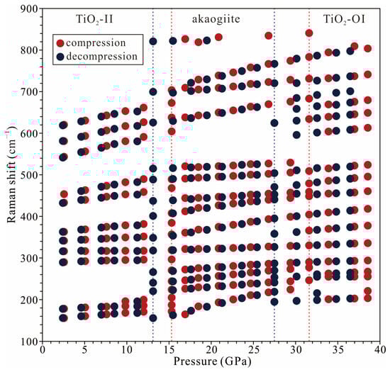 At 31.60 GPa, the Raman spectrum of akaogiite exhibits significant changes, characterized by the appearance of new scattering peaks at 366, 479, and 634 cm−1, indicating the onset of its phase transition to TiO2-OI (Figure 5 and Figure 6). When the pressure reaches 33.89 GPa, the sample’s Raman spectrum shows scattering peaks at 201, 255, 262, 291, 332, 370, 409, 455, 485, 515, 604, 639, 669, 694, 732, and 794 cm−1 (Table S1). These spectral features confirm the complete transformation from akaogiite to TiO2-OI [2]. In the pressure range of 33.89 to 38.55 GPa (the maximum pressure studied), while these peaks continue to shift with increasing pressure, no further significant changes occur in the Raman spectrum characteristics (Figure 5 and Figure 6), suggesting no additional phase transitions within this range.