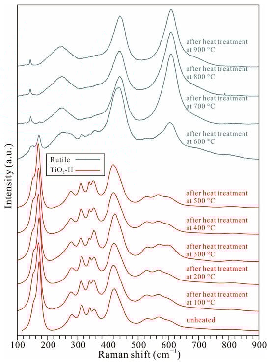 The Raman spectral features of the TiO2-II samples recovered after heating to 100, 200, 300, 400, and 500 °C remain consistent with those of the untreated sample (Figure 7). The primary scattering peaks of TiO2-II (observed at 170, 277, 311, 339, 352, 422, 529, and 568 cm−1) persisted after heating to 500 °C, with no significant changes in their relative intensities. Furthermore, no new peaks appeared in the Raman spectra of the recovered samples (Figure 7). These results indicate that the TiO2-II sample retained structural stability at temperatures of up to 500 °C under ambient pressure. Compared with the untreated TiO2-II sample, the recovered TiO2-II sample after heating to 600 °C shows significant changes in the Raman spectral features. The Raman spectrum of the recovered sample exhibits three new strong scattering peaks at 255, 436, and 609 cm−1, which are characteristic of the rutile phase [15,16]. These observations indicate that the phase transformation from TiO2-II to rutile initiates within the temperature range of 500–600 °C. In the Raman spectrum of the sample recovered after heating to 700 °C, the scattering peaks (170, 311, 339, and 352 cm−1) previously observed in the Raman spectrum of TiO2-II disappear (Figure 7). This change suggests the completion of the phase transformation from TiO2-II to rutile.