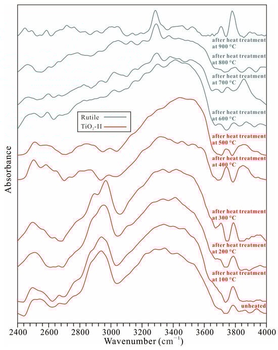 The infrared spectral features of the water-bearing TiO2-II recovered after heating to 100, 200, and 300 °C remained consistent with those of the untreated sample (Figure 8). After heating to 400 °C, the vibrational peak at 2900–3000 cm−1 disappeared, while the peaks in the range of 3000–3600 cm−1 persisted. This demonstrates that hydroxyl groups at different positions within the TiO2-II crystal structure exhibit varying thermal stability. After the phase transformation of TiO2-II to rutile (after heating to 600 °C), the peaks in the 3000–3600 cm−1 range remained visible (Figure 8). However, their peak heights decreased after heating to 700 °C, indicating dehydration of the sample. After heating to 900 °C, the infrared spectrum of the sample was characterized by a relatively sharp vibrational peak at 3290 cm−1 (Figure 8). The position of this peak aligns with the hydroxyl vibrational band observed in the infrared spectra of the natural rutile samples used in this study (Figure 2) and those reported in previous studies [23,26].