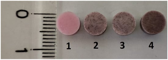 Commercial RTV-530 silicone rubber (SR) from Prochima and Bi-Fe-oxide particles were combined to create three elastomer-type composite samples. The BiFeO3/Bi25FeO40 powder mixture was gradually added to a silicone rubber matrix and continuously mixed for 10 min to ensure uniform dispersion of the filler. The resulting mixture was then cast and cured under ambient conditions. The sample denoted by SR is silicone rubber, the sample denoted by SR-BFO1 is a composite consisting of silicone rubber and 5 wt% BiFeO3/Bi25FeO40 powder (90 wt% BiFeO3 and 10 wt% Bi25FeO40), the sample denoted by SR-BFO2 is a composite composed of silicone rubber and 5 wt% BiFeO3/Bi25FeO40 powder (80 wt% BiFeO3 and 20 wt% Bi25FeO40), and the sample denoted by SR-BFO3 and is a composite composed of silicone rubber and 5 wt% BiFeO3/Bi25FeO40 powder (70 wt% BiFeO3 and 30 wt% Bi25FeO40). The four elastomer samples are shown in Figure 1