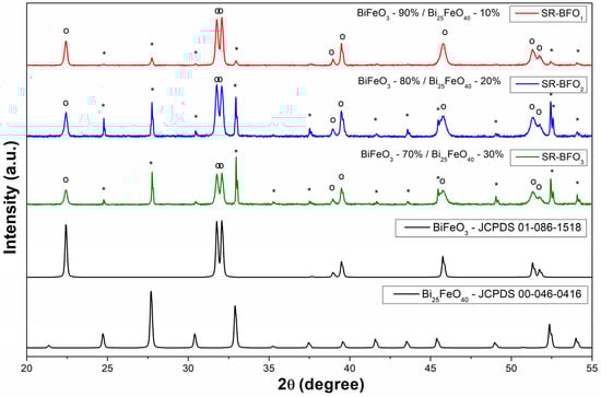 XRD patterns for the Bi-Fe-O powders. (°—BiFeO3; *—Bi25FeO40).