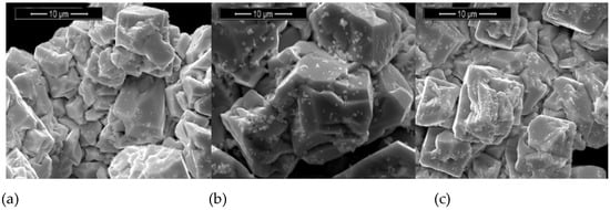 SEM analysis performed on the Bi–Fe–O powders showed the presence of small secondary phases on the BiFeO3 grain surfaces. These secondary phases appear as small, lighter particles distributed across the surfaces of the larger BiFeO3 grains and are attributed to the Bi25FeO40 phase. The presence of small grains in varying amounts, as observed in Figure 3a–c, supports the XRD results and confirms the coexistence of two distinct phases within the material.