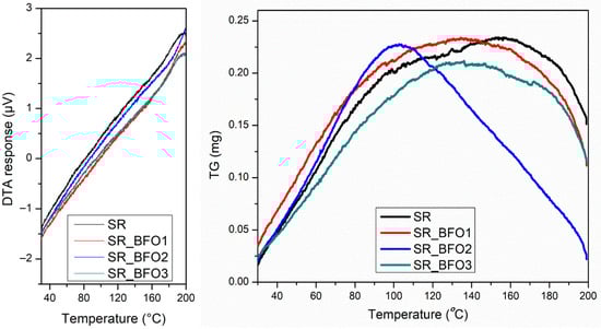 Figure 4 illustrates the TG-DTA results for the four samples. These results indicate good thermal stability up to 200 °C. Although the TG curve of the SR_BFO2 sample shows a slightly different shape compared to the other samples, the overall mass change remains below 1% for all cases; therefore, this variation is considered negligible and does not indicate any significant thermal or compositional difference having no corresponding features observed in the DTA heat flow signals. The absence of endothermic or exothermic events in the DTA curves implies that no phase transition or other significant thermal transformations occurred within this temperature range.