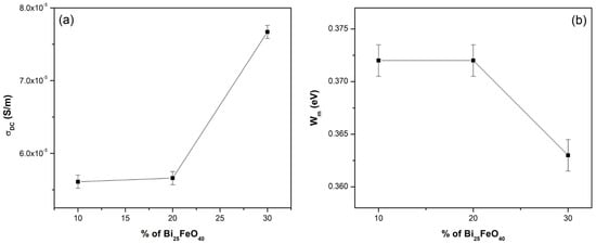 To have a suggestive picture of the dependence of σDC and Wm on the secondary phase concentration (Bi25FeO40), the experimental results were graphically presented in Figure 7. The experimental data are spline-interpolated, providing a smooth representation of the trend. It shows that sample SR-BFO3 exhibits the lowest energy of the potential barrier among the compared materials, indicating a reduced energy requirement for charge carrier excitation. This narrower band gap is consistent with the enhanced electrical conductivity observed in previous measurements, suggesting that SR-BFO3 allows more efficient carrier transport.