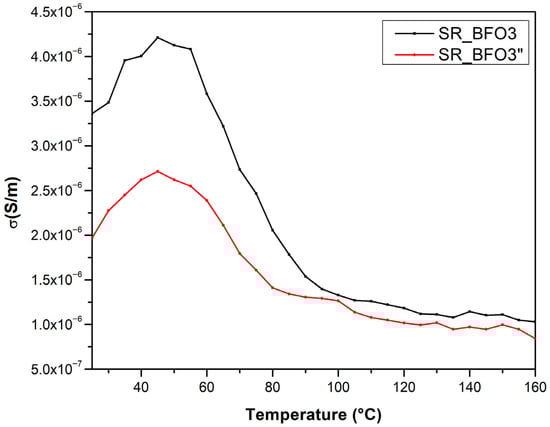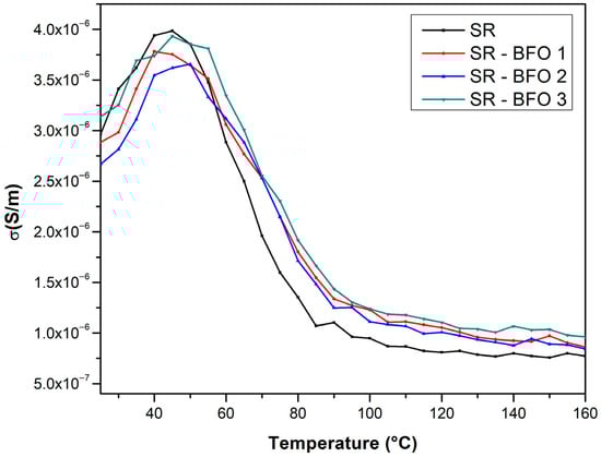 The temperature dependence of the electrical conductivity of the samples was also measured, from room temperature to 160 °C, and plotted in Figure 8.