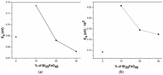 The concentration dependence of the activation energy Ea in BFO-doped silicone rubber (for reference, the SR sample is indicated by a red dot)—(a) Arrhenius model; (b) polaron hopping model.