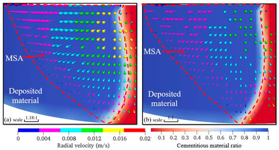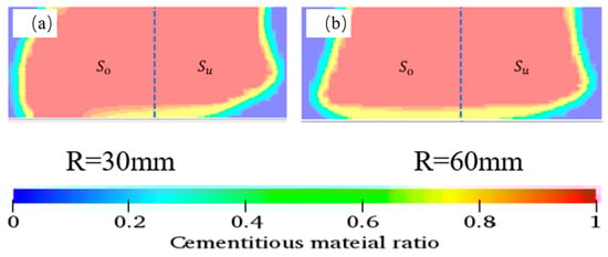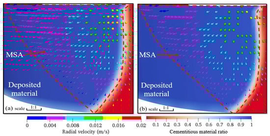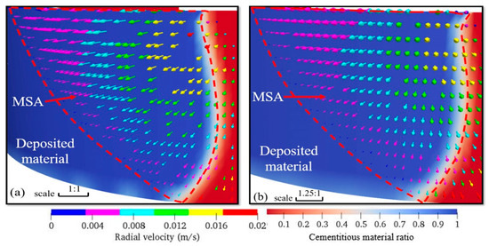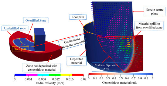 Two cases (A and B) located in subspaces I and IV, respectively, were selected to study the material flow behaviour at different printing process parameters during the material deposition process. The cross-section ratio Φ decreased as the printing process parameters changed from Case B to Case A. More material spilled from the overfilled zone of the filament for Case A compared to Case B, as shown in Figure 7. The material radial velocity distribution within the material spillover area was similar in Figure 7a,b. However, the material crossing area, as shown in Figure 7a, was larger than that in Figure 7b, thus causing more material to be deposited to the underfilled zone for Case A as compared to Case B. The cementitious material ratio refers to the ratio of the mortar-to-fluid ratio in the simulation. When the cementitious material ratio is 1, it means that the material exhibits 100% of the cementitious material behaviour. On the other hand, when the ratio is 0, it represents an atmospheric environment. The mortar-to-fluid ratio is used to determine the interaction between the material and the environment. This allows for an examination of the inter-region of the material behaviour due to this interaction [27].