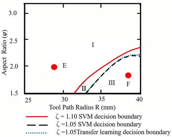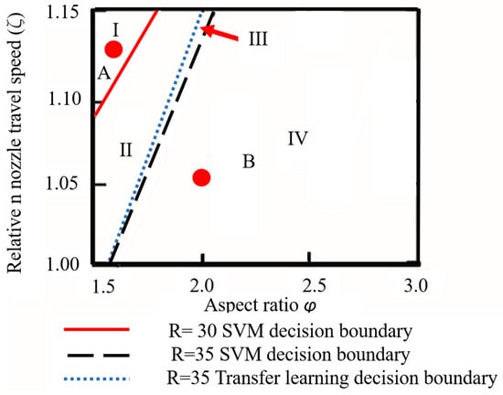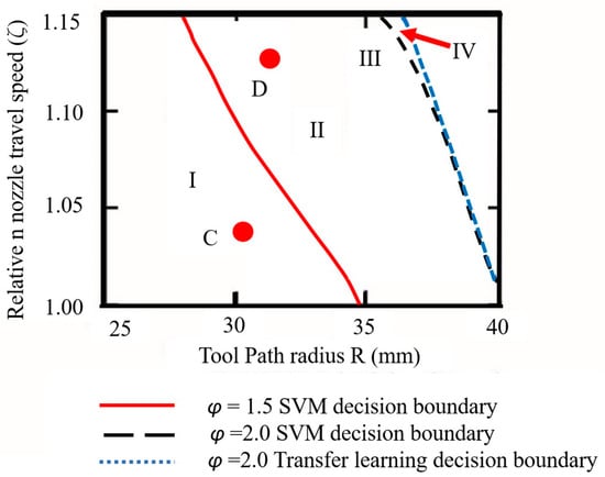 Thereafter, with the intention to reuse the previous data (collected for φ = 1.5) and improve the prediction accuracy of the SVM model, transfer learning was used to capture the knowledge from the previous window (φ = 1.5). By combining the source domain data (collected for φ = 1.50) and target domain data (collected for φ = 2.0) as training data, the decision boundaries identified by transfer learning (input R and ζ, output Φ) are shown in Figure 9, represented by the green dotted line. The subspaces III and IV (Φ < 1.20) identified by transfer learning can be considered as the printing process windows when φ = 2.