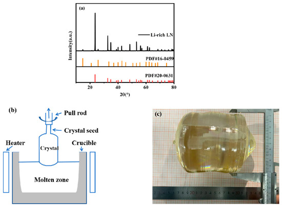 (a) XRD of the Li-enriched polycrystalline material. (b) Schematic diagram of the Li-enriched Czochralski growth method device. (c) Crystal growth diagram.