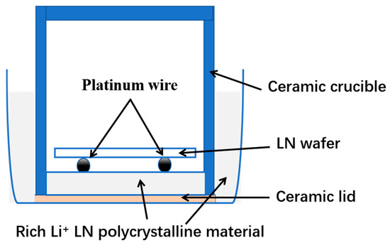 Under the same diffusion conditions described above, a commercial CLN wafer was used for diffusion experiments to form a Z-cut NSLN wafer; the thickness was measured using a thickness gauge, Model MINIAX DH-150, and its curvature was tested. A diagram of this diffusion setup is shown in Figure 2.