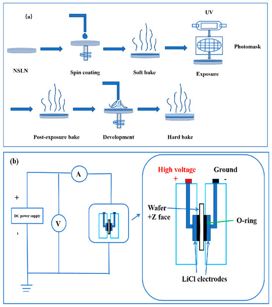 The optical properties of the samples were characterized using a spectroscopic ellipsometer, Model ES01A. The Z-cut NSLN wafers with the best quality of the three wafers above were selected and subjected to a preliminary cleaning treatment to remove contaminants, impurities, and oxides from the surface. The wafer surface was ensured to be clean and flat. The photoresist (RDPPI-I/GOI) was uniformly coated on the front side of the Z-cut NSLN wafer. A certain amount of photoresist was first dropped at the center of the wafer, and then the wafer was rotated at 4000 rpm to spread the photoresist uniformly on the wafer surface by centrifugal force, forming a photoresist film with a thickness of 1.2 μm. Soft baking was performed after coating to remove the solvent in the photoresist and to improve the adhesion and stability of the photoresist. The coated wafer was placed on the photolithography table, aligned with the design triangle pattern of the mask plate, and exposed. Post-exposure baking was performed to cure the pattern, and then the developer removed the photoresist from the unexposed/exposed areas to form the target pattern. High temperature baking after development further enhanced adhesion of the adhesive film, and a flowchart of the insulating electrode preparation is shown in Figure 3a. Polarization of the wafer was performed after photolithography. A homemade plexiglass fixture containing saturated LiCl solution was used to connect a DC-regulated power supply to apply an electric field to the Z-cut NSLN wafer. When the strength of the external electric field exceeded the crystal coercive field, the critical voltage corresponding to the current surge was recorded, and the voltage was maintained until the current returned to zero, completing the domain inversion, and the polarization schematic is shown in Figure 3b. The completed domain inversion wafer was then placed in a mixed hydrofluoric acid–nitric acid solution (HF:HNO3 = 1:3) and corroded in a boiling water bath for 1 h, so that the inverted domain structure was visible.