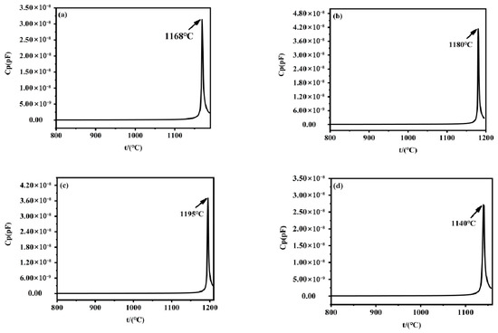 A high-temperature dielectric temperature spectrometer was used to determine the Curie temperatures of the head, middle, and tail of the Li-rich Czochralski growth method-grown and processed Z-cut NSLN wafers and the control CLN wafers, by detecting the sudden change characteristics of capacitance constants in the process of ferroelectric–parabolic phase transition, and the results are shown in Figure 4. The “ferroelectric–paraelectric” phase transition in ferroelectric materials specifically refers to the critical process where the material transforms from the ferroelectric phase (with spontaneous polarization) to the paraelectric phase (without spontaneous polarization) near the Curie temperature. This phase transition fundamentally represents a physical phenomenon involving structural symmetry change and abrupt property variation at specific temperatures. As can be seen from the figure, the Curie temperatures were 1168 °C, 1180 °C, 1195 °C, and 1140 °C, which correspond to (a), (b), (c) and (d) in Figure 4, respectively. Due to lithium being a light element, directly measuring its concentration often yields imprecise results. Researchers have therefore developed indirect characterization methods, such as the Curie temperature measurement [25]. According to the theoretical equation (1) for Curie temperature versus lithium content presented in reference [26], where Tc and C are the Curie temperature and Li2O concentration (mole%), respectively. The lithium content was calculated as 49.1%, 49.5%, and 49.9% for the head, middle, and tail, and 48.5% for the CLN control, respectively. It could be concluded that there was a significant compositional inhomogeneity (>0.4% difference in head/middle/tail lithium content) in the crystals grown by the lithium-rich Czochralski growth method. This inhomogeneity may affect the performance of the crystals and therefore further studies are needed to optimize the growth process to reduce this compositional difference.
