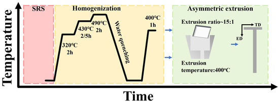 Asymmetric extrusion utilized a die with asymmetry coefficient 1.5 (extrusion channel length ratio). Following 400 °C/1 h preheating of alloys and die, extrusion proceeded at a ratio of 15 and a speed of ~16 mm/s. Water quenching produced 22 mm × 3 mm cross-section sheets. The experimental sequence is detailed in Figure 1.